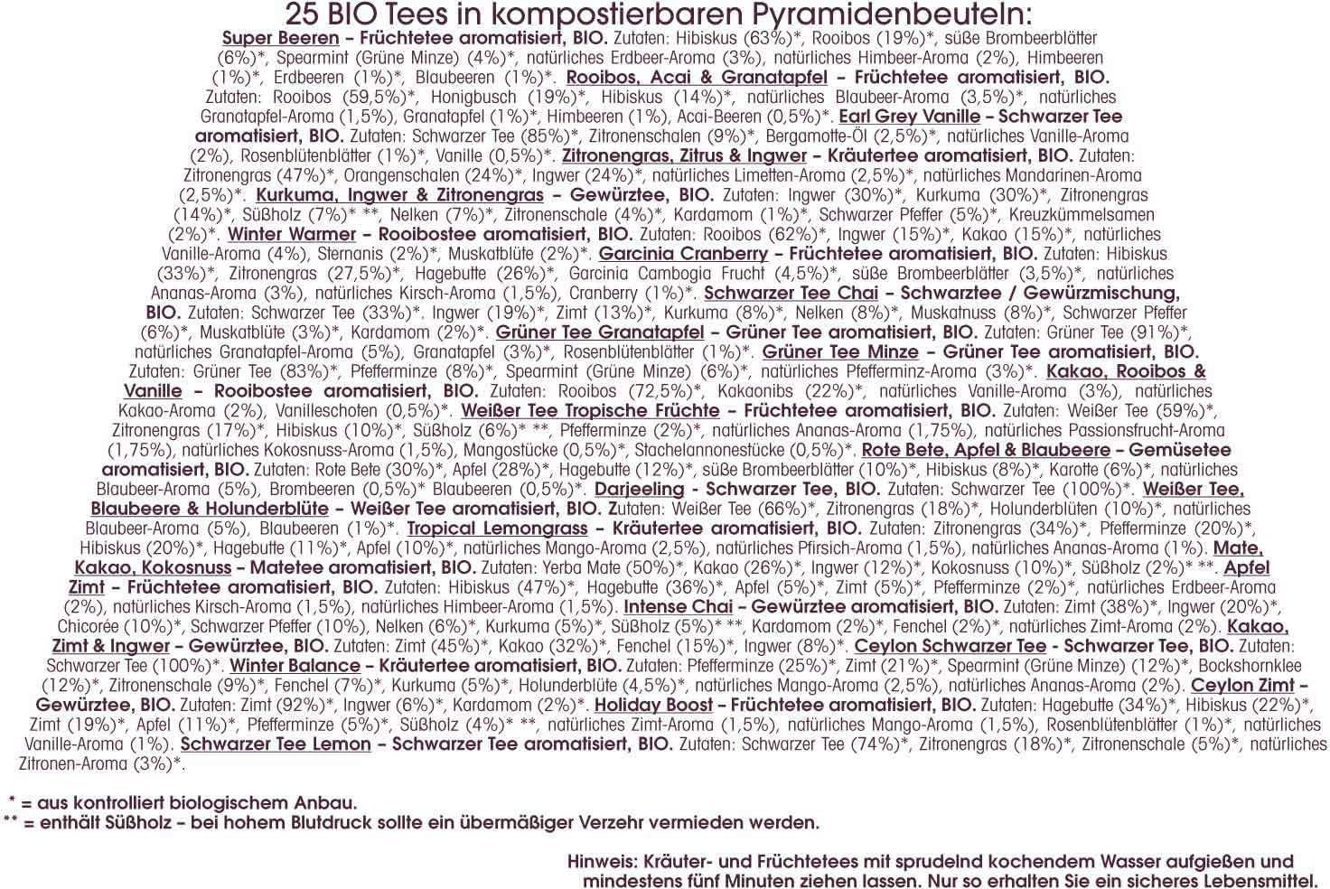 The fully compostable, plastic-free pyramid bags contain organic ingredients with the quality of loose leaf tea and are therefore particularly aromatic! Taste your way through a variety of pure and flavoured black, green, fruit and herbal teas as well as spice tea and rooibos tea.