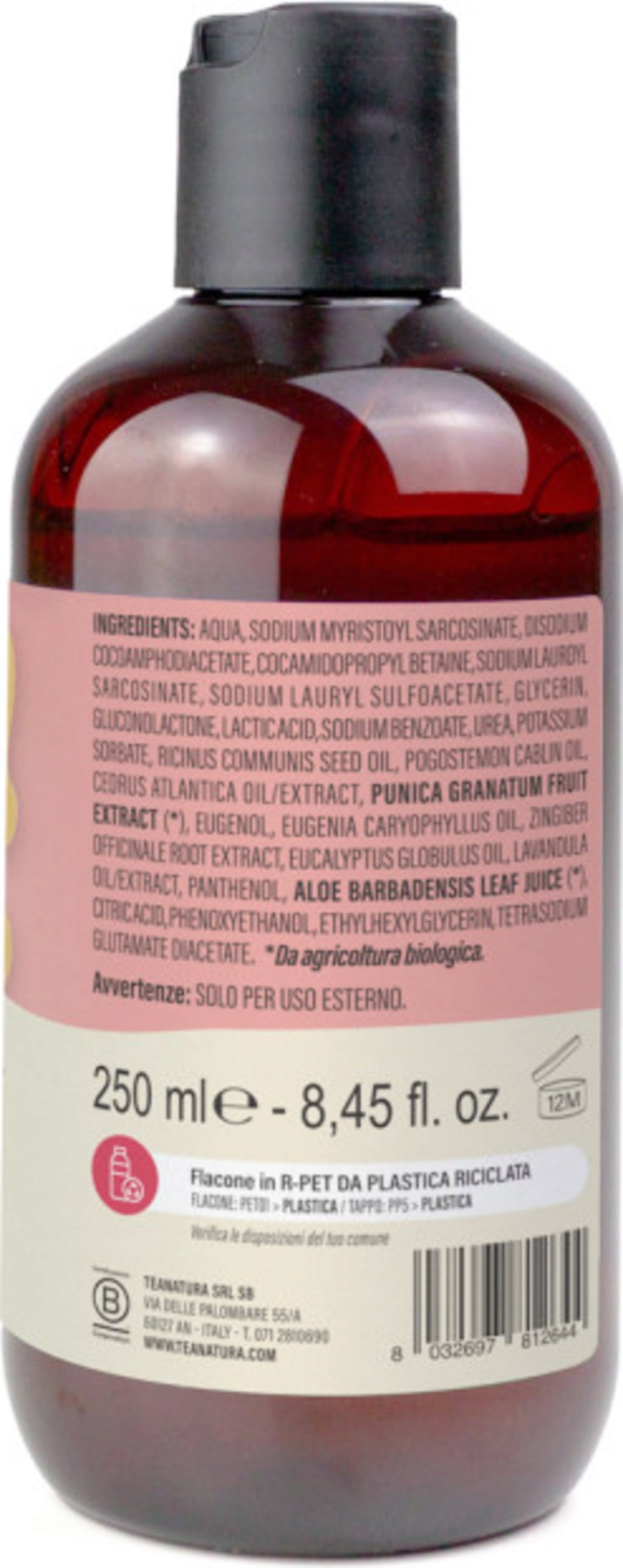 Aqua, Sodium Myristoyl Sarcosinate, Disodium Cocoamphodiacetate, Cocamidopropyl Betaine, Sodium Lauroyl Sarcosinate, Sodium Lauryl Sulfoacetat, Glycerin, Gluconolactone, Lactic Acid, Sodium Benzoate, Urea, Potassium Sorbate, Ricinus Communis Seed Oil, Pogostemon Cablin Oil, Cedrus Atlantica Oil/Extract, Punica Granatum (Pomegranate) Fruit Extract[1], Eugenol, Eugenia Caryophyllus Oil, Zingiber Officinale Root Extract, Eucalyptus Globulus Oil, Lavandula Oil/Extract, Panthenol, Aloe Barbadensis Leaf Juice[1], Citric Acid, Phenoxyethanol, Ethylhexylglycerin, Tetrasodium Glutamate Diacetate