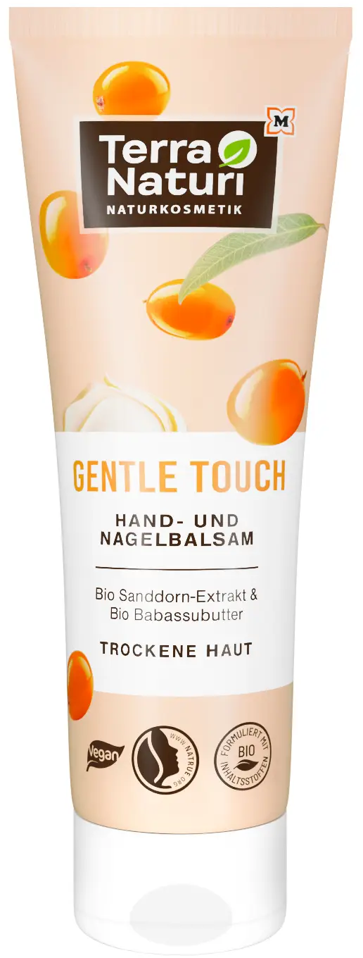 The GENTLE TOUCH Hand and Nail Balm provides optimal care for rough and stressed hands and dry skin. High-quality ingredients, such as organic sea buckthorn extract and organic babassu butter, intensively moisturise the skin and leave it feeling supple.