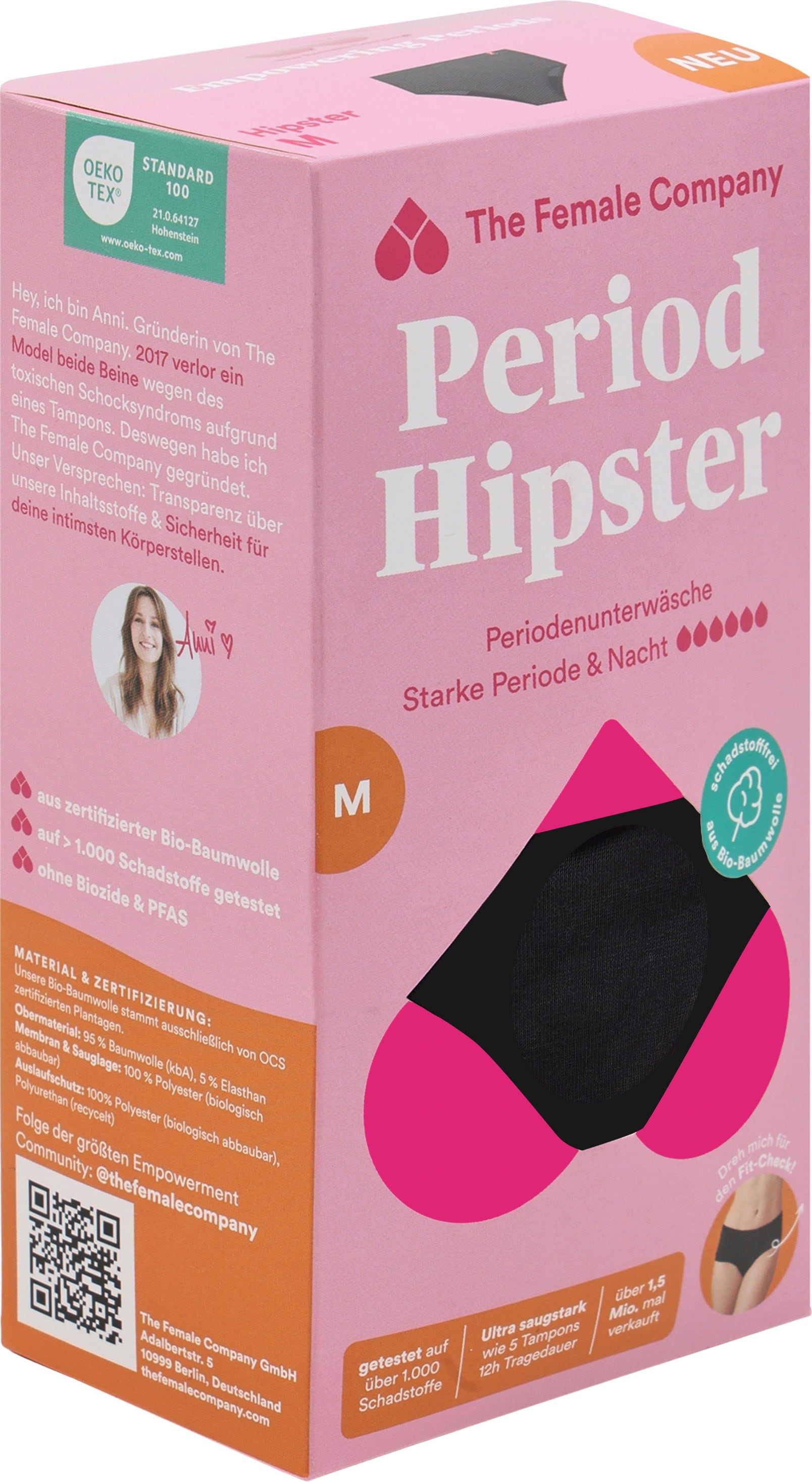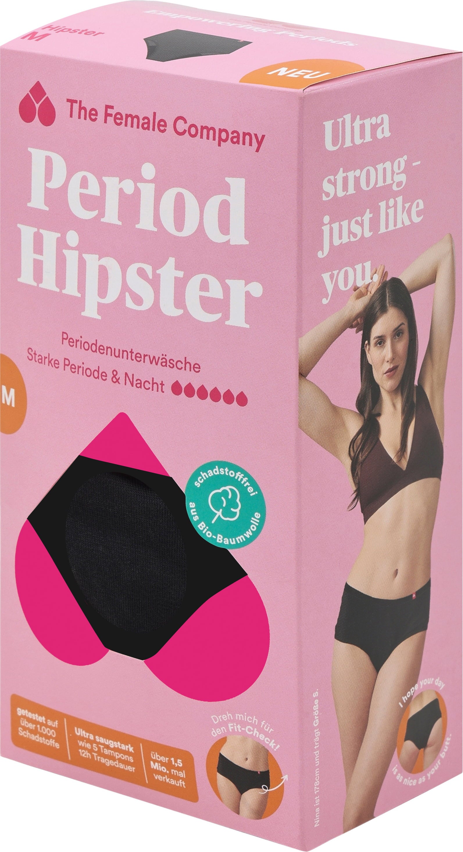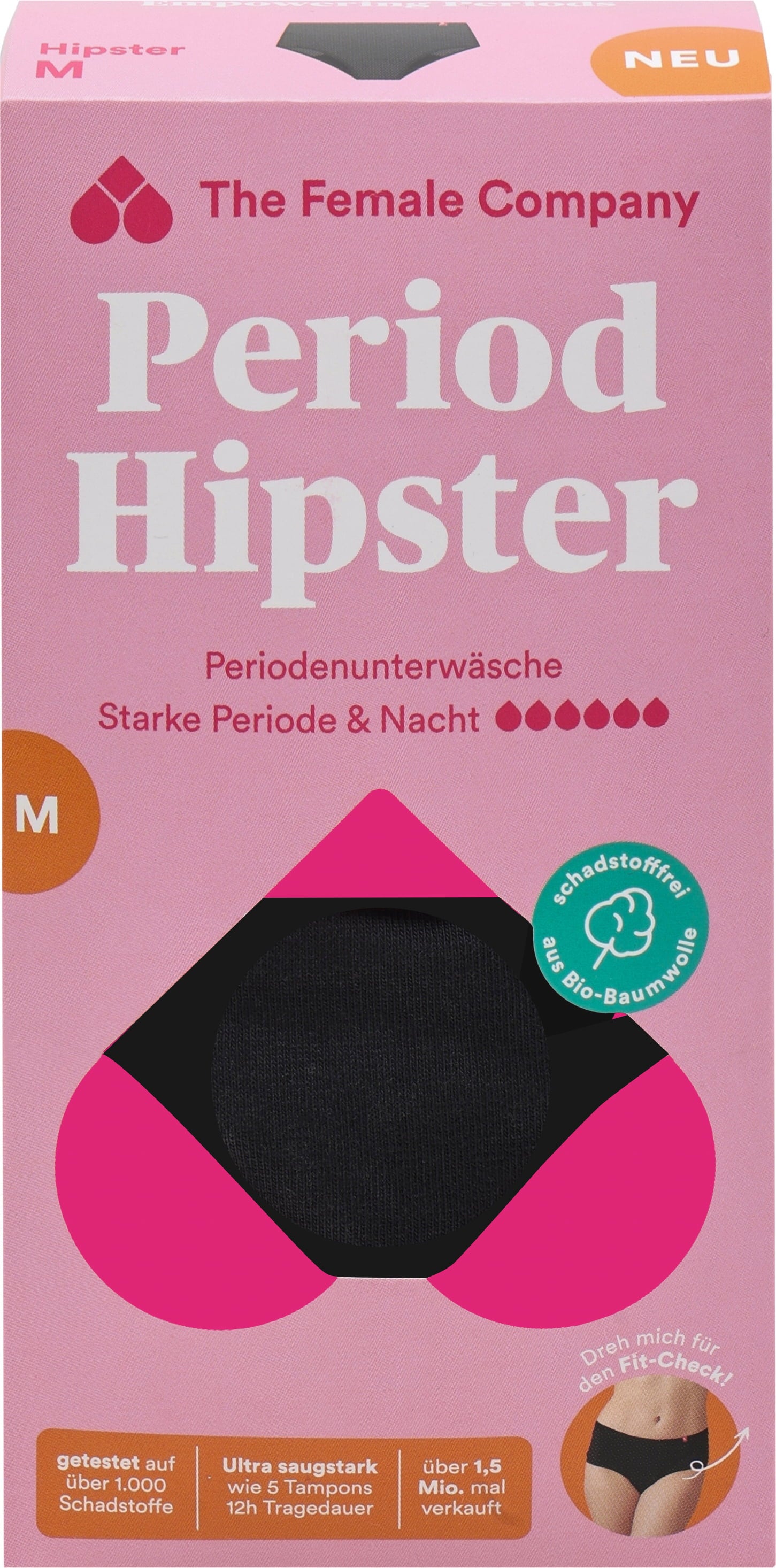 The Hipster period underwear is the most absorbent of the briefs and dries very quickly. Thanks to the innovative seam processing with Fluid Protection®, side leakage is prevented. The panties are only 1 mm thicker than conventional underwear.