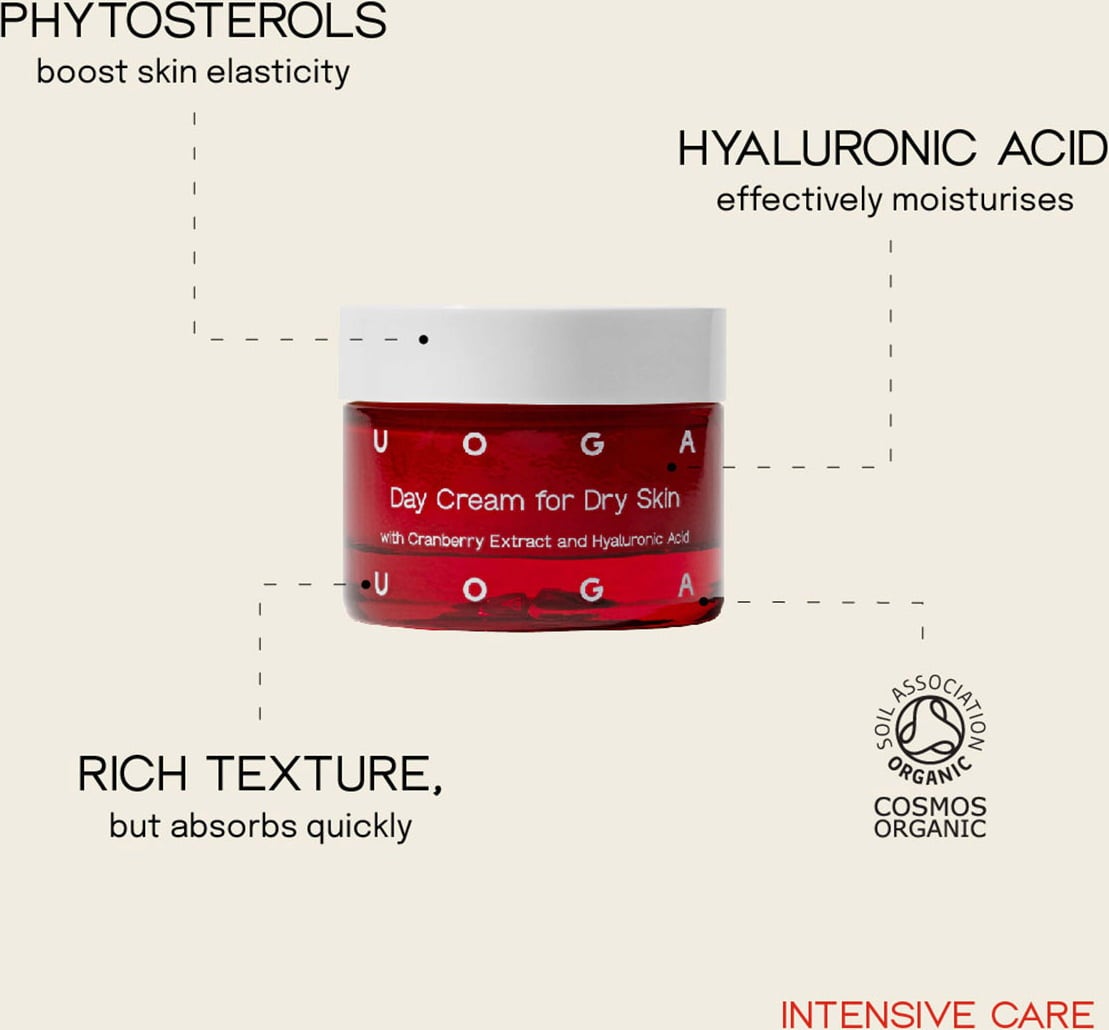 uoga uoga's Intensive Care Day Face Cream for Dry & Normal Skin has a thick and oily consistency that softens dry, normal and chapped skin. Oils sourced from rosehips, shea and jojoba are responsible for moisture absorption and moisture preservation in the skin. The skin is strengthened and radiance renewed thanks to added botanicals.