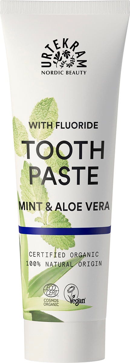The new Cosmos organic standard now allows the use of sodium fluoride. Therefore, the new Urtekram toothpaste is now available with mint and fluoride for all those who would like their teeth protected with fluoride while still reaping all the benefits of Urtekram's natural protection.